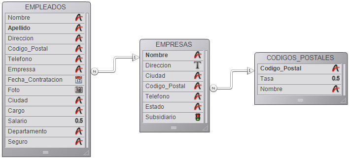 Si tiene varias tablas relacionadas, el control de integridad referencial se activa para cada relación como en una cadena. Por ejemplo, imagine que tiene la estructura de la siguiente imagen. Si elimina un registro de la tabla [CODIGOS_POSTALES] (tabla Uno) y la opción Eliminar registros relacionados ha sido seleccionada para cada relación, 4D primero elimina los registros correspondientes de la tabla [EMPRESAS] y luego elimina los registros de todas los empleados que trabajan para esas empresas en la tabla [EMPLEADOS].