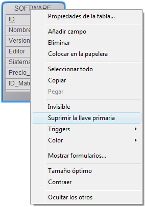 Haga clic derecho sobre la tabla que contiene la llave primaria y elija Suprimir la llave primaria en el menú contextual: