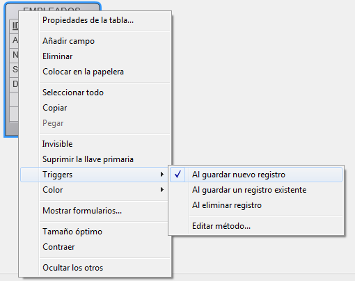Los eventos triggers pueden configurarse en el Inspector o vía el menú contextual asociado a la tabla (clic derecho en el área de título de la tabla):