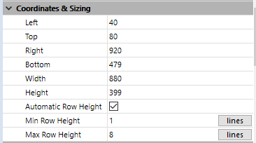 La propiedad está desmarcada por defecto. Cuando se activa para al menos una columna, se muestran las opciones Altura mínima de la línea y Altura máxima de la línea en lugar de las opciones del list box Altura de la línea y Arrayde altura de línea (ver Tema Coordenadas y dimensiones).