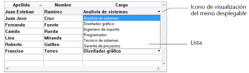 Lista de obligatorios: permite designar una lista donde sólo estos valores pueden ser insertados en la columna. Los valores de la lista son accesibles utilizando un menú desplegable asociado a cada celda (favor remitirse a la propiedad “Lista de valores” en el tema Fuente de datos). A diferencia de la propiedad Lista de valores, cuando una lista obligatoria es definida, no es posible la entrada de datos utilizando el teclado, solo es permitida la selección de un valor de la lista utilizando el menú desplegable. Si varias listas son definidas utilizando las propiedades Lista de valores y Lista de obligatorios, la propiedad Lista de obligatorios tiene prioridad.