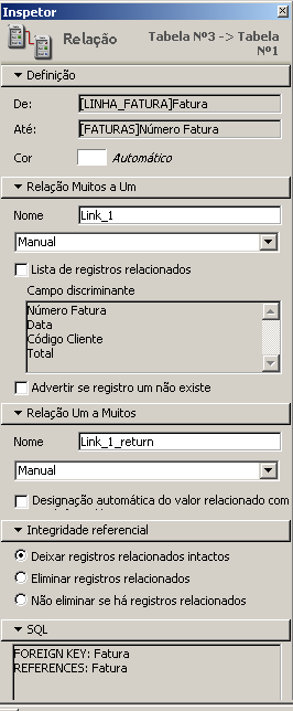 Para as relações, a área indica as propriedades FOREIGN KEY e REFERENCES.