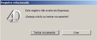 • Advertir se registro Um não existe: Se esta opção estiver selecionada, 4D mostra uma caixa de diálogo que permite ao usuário criar o registro Um relacionado se não existir. Por padrão, quando você introduzir um valor em um campo relacionado da tabela Muitos, 4D verifica se existe um registro correspondente na tabela Um relacionada. Se 4D não o encontra, aparece a caixa de diálogo a seguir: