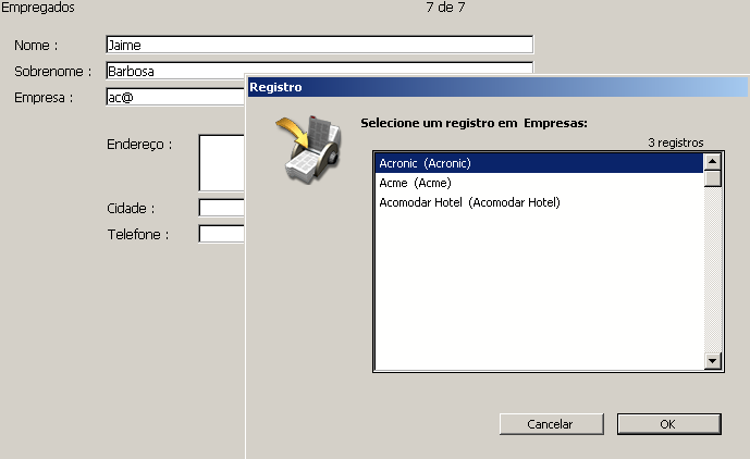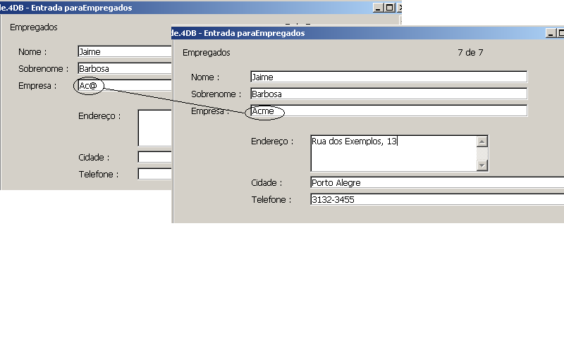 Por exemplo, imagine que o usuário está criado um registro na tabela [Empregados]. Em vez de escrever Acme no campo Empresa, o usuário pode escrever Ac@ e logo pressionar a tecla Tab para passar ao próximo campo. Como @ é o caractere curinga de 4D, esta entrada  significa que “o valor começa por “Ac” e está seguido por outros caracteres”. 4D busca na tabela relacionada o registro que corresponda a este critério. Se só encontra um registro, completa a entrada automaticamente e passa o próximo campo na ordem de entrada do formulário.
