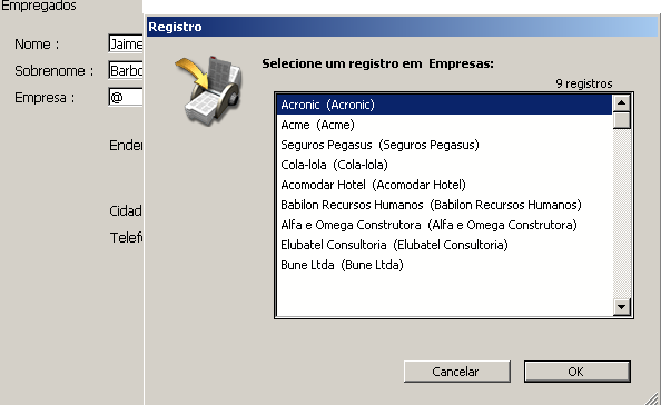 Para ver uma listagem completa de todas as empresas na tabela [Empresas], o usuário digita apenas @. 4D exibe uma lista de todas as companhias para que o usuário escolha a correta. A figura abaixo mostra uma lista de companhias sendo exibida: