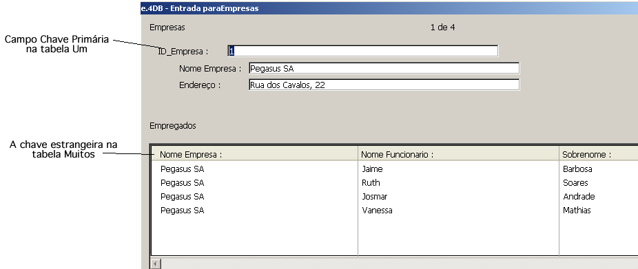 Na relação entre a tabela [Empresas] e a tabela [Empregados], a tabela [Empresas] é uma tabela Um e a tabela [Empregados] é a tabela Muitos relacionada. Cada empresa tem um registro na tabela [Empresas] e vários registros na tabela [Empregados]. Quando o campo chave estrangeira da tabela Muitos é exibido no sub-formulário, você pode ver o efeito desta opção: o valor do campo é copiado automaticamente no sub-formulário cada vez que se adiciona um sub-registro.