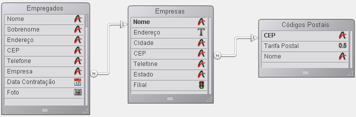 Se existirem várias tabelas relacionadas, o controle de integridade referencial é ativado para cada relação como uma cadeia. Por exemplo, imagine que você tenha a estrutura a seguir. Se você eliminar um registro da tabela [CODIGOS_POSTAIS] (tabela Um) e a opção Excluir registros relacionados tiver sido selecionada para cada relação, 4D primeiro elimina os registros correspondentes da tabela [EMPRESAS] e logo elimina os registros de todos os empregados que trabalham para essas empresas na tabela [EMPREGADOS].