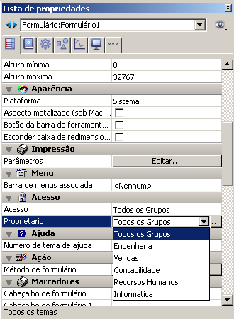 A lista Acesso define qual grupo pode utilizar o formulário na janela de visualização de registros ou em uma aplicação personalizada. Se um usuário que não pertence a este grupo intenta utilizar o formulário, 4D mostrará uma mensagem indicando ao usuário que sua senha não permita acessar ao formulário.
