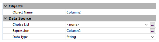 Caso se passe uma expressão não atribuível (por exemplo [Person]FirstName + "" + [Person]LastName), a coluna não é editável mesmo se a opção Enterable estiver marcada. Caso se utilize um campo, variável, uma expressão atribuível (por exemplo Person.lastName) for usad, a coluna será editável ou não dependendo da opção Editável Em modo Desenho, o tipo de fonte de dados é mostrado na primeira linha da coluna. Por exemplo, [Table1]MyFld. Se a expressão definida não for correta, a coluna do list box vai exibir uma mensagem de erro no modo Aplicação.