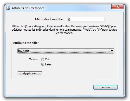 La boîte de dialogue “Attributs des méthodes” permet de modifier un attribut de méthode projet (Invisible, Offerte comme Web Service, etc.) pour la totalité ou une partie des méthodes de la base en une seule opération. Cette fonction est très utile pour modifier les attributs d’un grand nombre de méthodes projet. Elle peut également être utilisée en cours de développement pour appliquer rapidement des attributs communs à des groupes homogènes de méthodes.