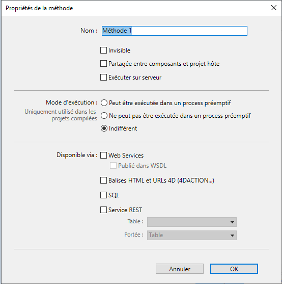 Après avoir créé une méthode projet, vous pouvez la renommer et modifier ses propriétés. Les propriétés des méthodes projet définissent principalement leurs conditions d’accès et de sécurité (accès par les utilisateurs, les serveurs intégrés ou les services) ainsi que leur mode d'exécution.