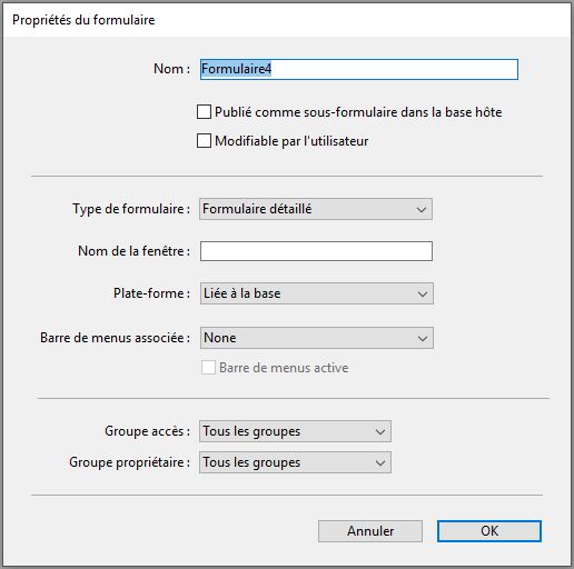 La plupart des propriétés contenues dans cette boîte de dialogue (nom, accès, plate-forme, etc.) peuvent également être définies dans la Liste des propriétés de l'éditeur de formulaires. Elles sont décrites dans la section Propriétés des formulaires. Seule la propriété "Publiée comme sous-formulaire dans la base hôte" (décrite ci-dessous) n'est accessible que dans cette boîte de dialogue.
