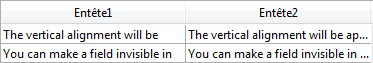 Retour à la ligne (colonnes de type texte uniquement) : permet de gérer l’affichage du contenu de la colonne lorsque ce contenu dépasse la largeur de la colonne. Lorsque l’option est cochée, le texte de la colonne passe automatiquement à la ligne suivante, si la hauteur de la colonne le permet, lorsque sa largeur excède celle de la colonne. Lorsque l’option n’est pas cochée, un texte trop long est tronqué et affiche une ellipse (...). Dans l’exemple suivant, l’option Retour à la ligne est cochée pour la colonne de gauche et elle n’est pas cochée pour la colonne de droite : A noter que, quelle que soit la valeur de l’option Retour à la ligne, la hauteur des lignes n’est pas modifiée. Si le texte avec retours à la ligne ne peut être affiché en totalité dans la colonne, il est tronqué (sans ellipse). Dans le cas des list box n’affichant qu’une ligne, seule la première ligne est affichée :