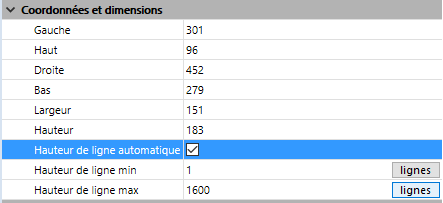 La propriété est décochée par défaut. Lorsque vous la cochez pour au moins une colonne, les options Hauteur de ligne min et Hauteur de ligne max sont affichées à la place des options de list box Hauteur des lignes et Tableau hauteurs de lignes (voir Thème Coordonnées et dimensions)