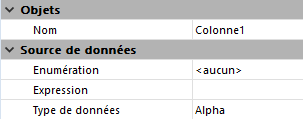 Type de données (list box de type sélection) : ce menu permet de définir le type de l’expression ou de la variable associée à la colonne. Elle est utilisée pour déterminer le format d’affichage à appliquer et permet de mettre à jour le menu Type d’affichage dans le thème “Affichage”. Si un champ est saisi dans la zone Expression, la propriété Type de données n’est pas affichée, le format d’affichage correspond dans ce cas au type du champ.