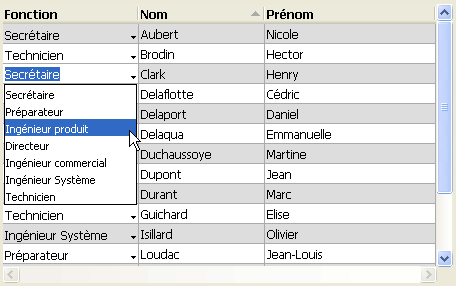 Enumération : cette propriété permet d’associer une énumération à la colonne de list box. Si vous désignez une énumération, l’utilisateur pourra utiliser ses valeurs (affichées via un pop up menu) pour modifier les valeurs de la colonne et de son tableau associé : A noter que la saisie au clavier reste possible. Si vous souhaitez que les valeurs ne puissent être modifiées que via le pop up menu de sélection, choisissez une énumération obligatoire (cf. ci-dessous). Notes :