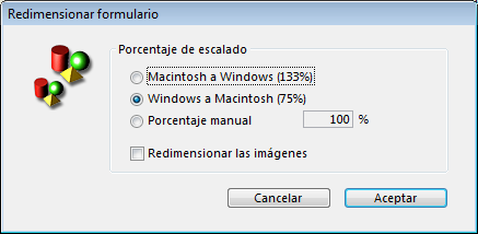 La caja de diálogo "Redimensionar formulario", permite redimensionar los objetos del formulario con el fin de que se vean bien cuando una base pase a otra plataforma.