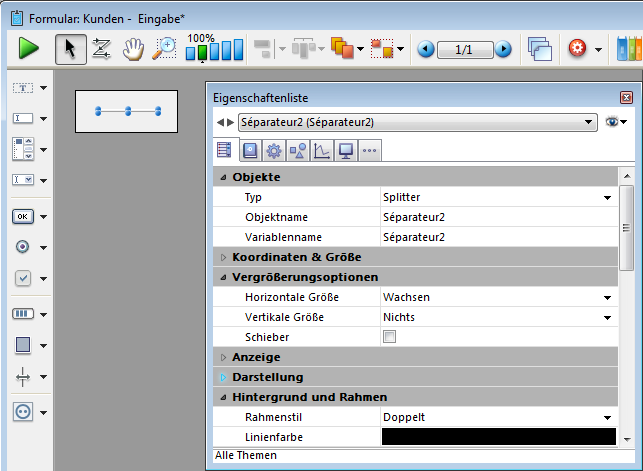Fügt einen horizontalen Splitter hinzu zum Unterteilen des ganzen Formulars oder Teilen davon in zwei Bereiche, die unabhängig vergrößerbar sind. Die vom Splitter abhängigen Objekte müssen passende Eigenschaften zum Vergrößern/Verkleinern haben.