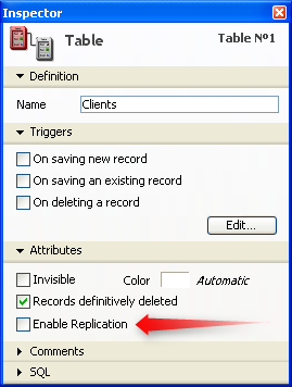 Para ativar o mecanismo interno de replicação, deve utilizar em cada tabela (na base remota e local), a propriedade de tabela Ativar replicação acessível no Inspetor de tabelas: