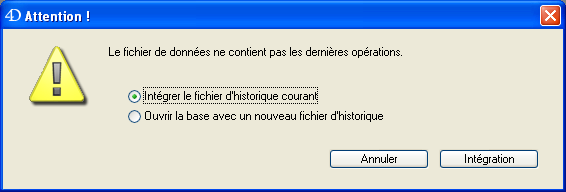 Si le fichier d’historique courant ou un fichier de sauvegarde d’historique ayant le même numéro que le fichier de sauvegarde est stocké dans le même dossier, 4D examine son contenu. S’il contient des opérations non présentes dans le fichier de données, le programme propose de l’intégrer. L’intégration est effectuée automatiquement si l’option d’intégration automatique de l’historique est cochée (cf. paragraphe ).