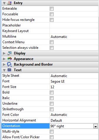 Cuando se elige una opción del menú "Orientación" (que no sea 0°) para un objeto de tipo variable o campo, las propiedades Editable y Enfocable se desactivan de forma automática para el objeto (si aplica):