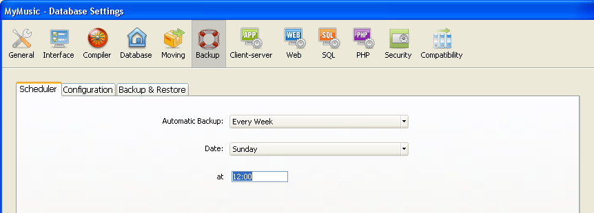 The options found on this tab let you set and configure scheduled automatic backups of the database. You can choose a standard quick configuration or you can completely customize it.