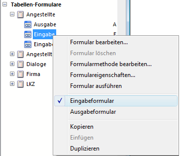 Im Explorer können Sie für jede Tabelle ein aktuelles Eingabe- und Ausgabeformular festlegen. Klicken Sie dazu in der hierarchischen Liste auf den gewünschten Formularnamen, und wählen im Kontextmenü den Eintrag Eingabeformular bzw. Ausgabeformular: