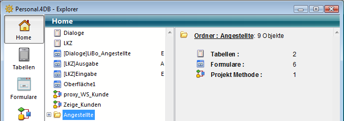 Ähnlich wie die Ordner in Windows und Mac OS Betriebssystemen enthalten 4D Ordner verschiedene Objekte, die nach eigenen Kriterien gruppiert werden, in der Regel nach Funktionalität und nicht nur nach Typ. Sie können z.B. im Ordner Meldungen alle Objekte gruppieren, die zum Meldungssystem in Ihrer Anwendung gehören. Sie können Objekte vom Typ Tabelle, Formular und Projektmethode in Ordner legen. Auch Unterordner auf mehreren Ebenen sind möglich. Alle selbst erstellten Objekte der Struktur, also Tabellen, Formulare und Projektmethoden erscheinen immer auf der Seite Home. Sie werden auch auf den anderen Seiten des Explorer aufgelistet.