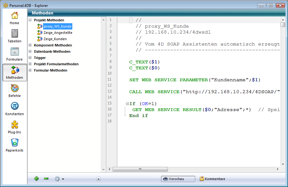Datenbankmethoden: Sie können keine neuen Datenbankmethoden erstellen. Sie können jedoch in einer leeren Datenbankmethode Programmiercode hinzufügen. Hierzu erweitern Sie den Eintrag Datenbankmethode und doppelklicken auf die gewünschte Datenbankmethode.