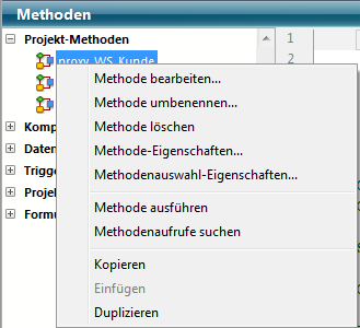 Sie können Projektmethoden direkt aus der Methodenliste im Explorer kopieren und einfügen, sowie duplizieren. Auf diese Weise können Sie eine Methode in der gleichen Anwendung duplizieren oder von einer Anwendung in eine andere kopieren.