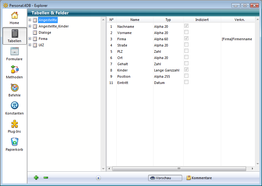 Dieser Bereich ist nur zur Information; Sie können hier keine Werte verändern. Es zeigt Nummer, Name und Typ der Felder für die ausgewählte Tabelle, sowie zugewiesene Indizes und Verknüpfungen. Für jedes Feld, von dem eine Verknüpfung ausgeht (Viele-Feld) wird in der Spalte Verkn. das Zielfeld (Eine-Feld) angezeigt.