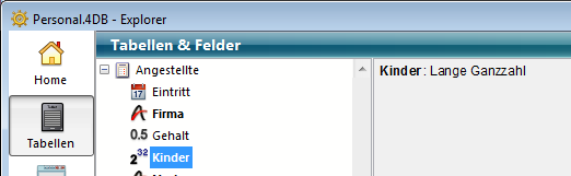 Der Feldtyp wird durch ein Icon links vom Namen angegeben. Um das Fenster mit den Feldeigenschaften zu öffnen, doppelklicken Sie auf einen Feldnamen. Weitere Informationen dazu finden Sie im Abschnitt Get database parameter.