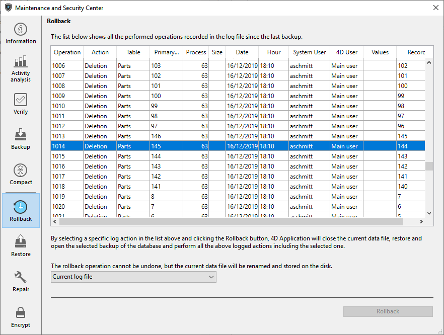 Auf dieser Seite können Sie auf die Funktion Rollback für die im Logbuch ausgeführten Operationen zugreifen. Sie arbeitet ähnlich wie die Operation Rückgängig auf mehreren Ebenen. Das ist besonders hilfreich, wenn ein Datensatz versehentlich in der Datenbank gelöscht wurde.