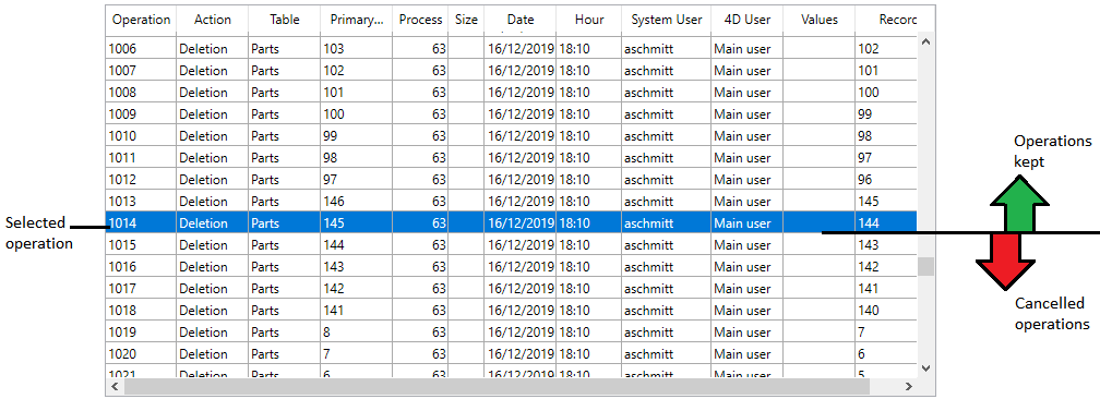 Um ein Rollback in den Operationen auszuführen, wählen Sie die Zeile, nach der alle Operationen annulliert werden sollen. Die Operation der gewählten Zeile bleibt als letzte erhalten. Wollen Sie z.B. einen Löschvorgang aufheben, wählen Sie die direkt davor liegende Operation. Diese bleibt dann erhalten, alle nachfolgenden Operationen werden zurückgefahren.