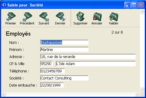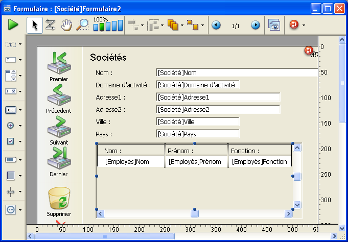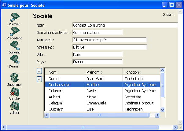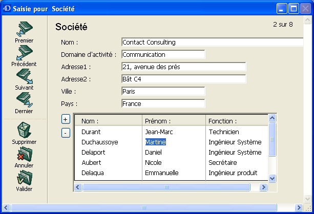 Par exemple, une base de gestion de contacts peut utiliser une instance de sous-formulaire en liste pour afficher tous les contacts d’une société. Bien que les contacts apparaissent dans l’écran général, l’information est en fait stockée dans la table liée. A l’aide d’un lien 1 vers N, la conception de cette base de données rend facile le stockage d’un nombre illimité de contacts pour chacune des sociétés. Avec des liens automatiques, vous pouvez permettre la saisie de données dans la table liée sans programmation.