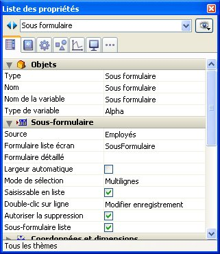 Dans la Liste des propriétés (thème “Sous-formulaire”), veillez à ce que l'option Sous formulaire liste soit cochée et choisissez la table source dans le menu Source ainsi que le Formulaire liste écran que vous voulez utiliser.