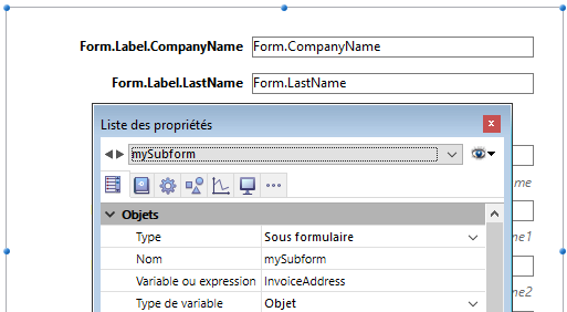 A noter que l’interaction entre le contenu de l’objet sous-formulaire et le formulaire parent doit être gérée par des mécanismes spécifiques (cf. ci-dessous le paragraphe Programmation inter-formulaires avancée).
