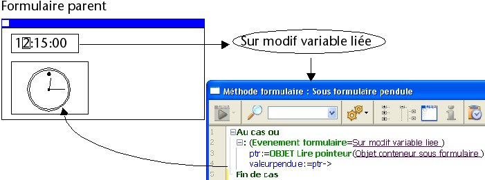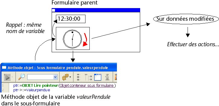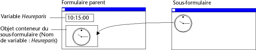La variable liée au sous-formulaire permet de relier les deux contextes (formulaire et sous-formulaire) pour mettre au point des interfaces sophistiquées. Imaginons par exemple un sous-formulaire représentant une pendule dynamique, inséré dans un formulaire parent contenant une variable saisissable de type heure :