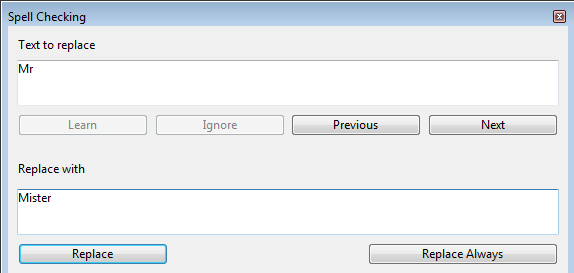 • テキストの置換: テキストの置換を有効化または無効化します。この機能は、ある単語を他の単語で置き換えるというものです。例えば、"Mr." を "Mister" で置き換える、といったようなことができます。"置き換えられる単語/以下の単語で置き換え"の単語のペアを作成するためには、スペルチェッカーダイアログを使用する必要があります。"辞書にありません" エリアに置き換えたい単語を入力し、それを置き換える単語を "以下で置換" エリアに入力して下さい。その後常に置換ボタンをクリックします: