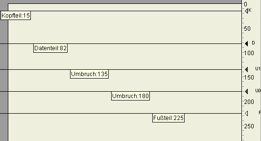 Sie bestimmen die Größe der einzelnen Bereiche, d.h. Kopfteil-, Daten-, Umbruchteil- und Fußteilbereich, durch Bewegen der Steuerlinien.