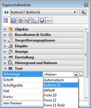Sie können die angelegten Stilvorlagen in der Eigenschaftenliste des Formulareditor aufrufen. Sie lassen sich für jedes Objekt mit Text verwenden, unabhängig ob statisch oder dynamisch, also Schaltflächen, Objekte vom Typ Feld und Variable, Registerkarten, Listboxen, etc.