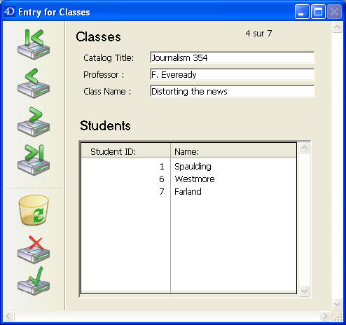 4D oferece três ações padrão para responder as necessidades básicas para a gestão de subregistros: Editar subregistro, Eliminar subregistro e Adicionar subregistro. Quando o formulário inclui vários subformulários, a ação se aplica ao formulário que tem o foco.