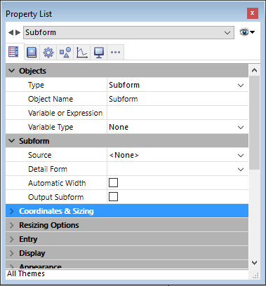 Si selecciona el tipo Objeto (con un nombre de variable especificado), podrá obtener o definir las propiedades de este objeto dentro del contexto del subformulario utilizando Form (ver Utilizar el objeto asociado al subformulario abajo).