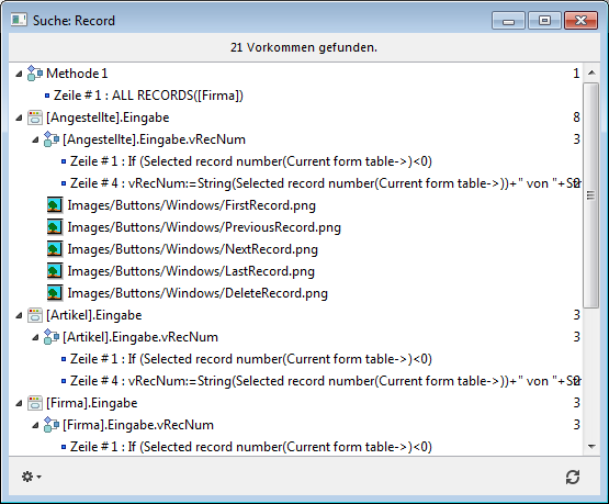 Durch Doppelklick auf eine Zeile können Sie das Objekt in seinem Editor ansehen. Sie können auch mehrere Suchen durchführen. Jede Suche öffnet ein eigenes Fenster, wobei die vorigen Fenster mit Suchergebnissen offen bleiben.