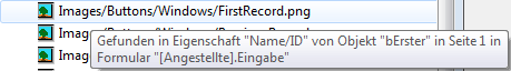 • Eigenschaft (falls zutreffend): Zeigt die Eigenschaft des Objekts, das zum Suchkriterium passt. Zum Beispiel werden im gleichen Formular ein String in einem Variablennamen gefunden (Eigenschaft Variable) und ein Objektname (Eigenschaft Name). Dieses Feld bleibt leer, wenn das passende Element das Objekt selbst ist.