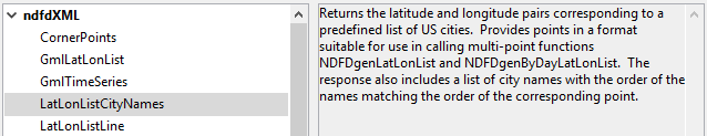 Haga clic en el botón Descubrir para que 4D analice el contenido del archivo WSDL. Después de un momento, el área central muestra los resultados del análisis del archivo: el (los) nombre(s) del servicio(s) web como también el (los) método(s) publicado(s) aparecen en forma de lista jerárquica. Nota: puede mostrar directamente el código fuente XML del archivo WSDL en su navegador web por defecto manteniendo presionada la tecla Mayús al hacer clic en el botón Descubrir. Al hacer clic en un servicio web se muestra su documentación (si la hay) al lado derecho de la ventana. De lo contrario, aparecerá la indicación “No documentación”. De la misma forma, la documentación (si existe) para cada método aparece cuando selecciona su nombre: Nota: si el análisis del archivo WSDL revela la presencia de parámetros de tipo complejo, el asistente muestra una bandera amarilla junto al método concerniente .