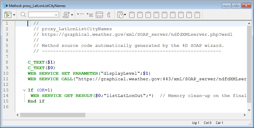 Para llamar un método proxy en su código, simplemente escriba su nombre y pase los parámetros requeridos. Estos parámetros se declaran en el área de encabezado del método proxy por el Asistente de servicios web. Conforme a la sintaxis estándar para pasar parámetros entre métodos en 4D, son llamados $0, $1, $2... Pueden visualizarse en los parámetros avanzados de la descripción del método publicado (ver Uso de parámetros avanzados) y a veces se describen en su documentación.