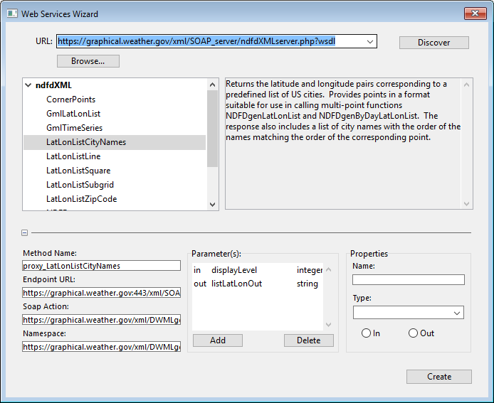 El botón Descubrir activa el análisis del archivo WSDL designado y el llenado de las áreas de información. El botón Examinar... muestra una caja de diálogo estándar de abrir archivos, permitiendo seleccionar un archivo WSDL almacenado localmente. Su ruta de acceso, comienza por “file://”, se muestra en el área “URL:” (es posible introducir manualmente la ruta de acceso en esta área). El botón Crear permite generar el método proxy correspondiente al servicio web seleccionado. El botón Cerrar cierra la caja de diálogo del asistente de servicios web.
