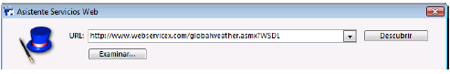 En el área “URL:”, introduzca o pegue el URL del archivo WSDL del servicio web a utilizar: Este URL puede provenir, por ejemplo, de un “directorio” de servicios web o haberse comunicado directamente por el servidor del servicio web. Igualmente puede especificar un URL local, es decir, la dirección de un archivo WSDL almacenado en su disco duro. Para hacer esto, haga clic en el botón Examinar... y elija el archivo WSDL local, o introduzca directamente su ruta de acceso en el área “URL:”. La ruta de acceso del archivo local comienza por “file://” luego utiliza el separador de carpetas del sistema. Debe pasar una ruta de acceso absoluta.