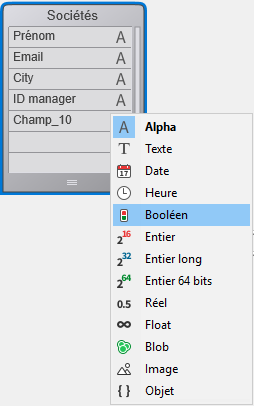 Cliquez sur l’icône du type du champ dans l’image de la table et choisissez le type souhaité dans le menu associé. OU Cliquez avec bouton droit de la souris sur le champ à retyper et choisissez le type souhaité dans le sous-menu Type du menu contextuel. OU Sélectionnez le champ à retyper puis cliquez dans la zone Type de la Palette Inspecteur afin d’afficher le menu des types.